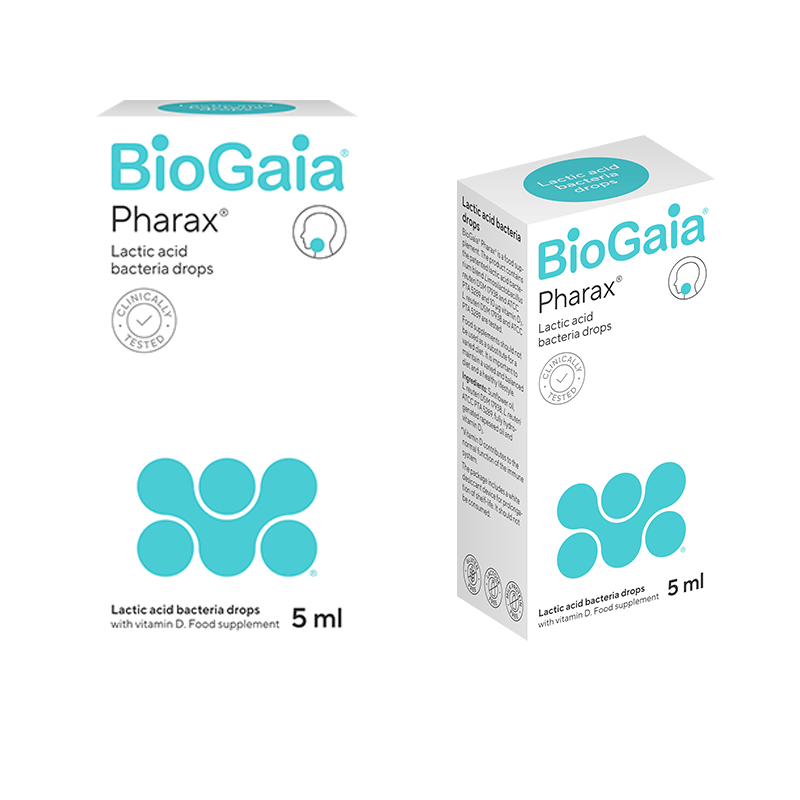 „BioGaia Pharax“ yra maisto papildas, padedantis palaikyti ir papildyti natūralią virškinamojo trakto, burnos ir gerklės mikroflorą.. Jame yra unikalus padermių derinys: Limosilactobacillus reuteri ATCC PTA 5290, išskirta iš burnos ertmės, ir Limosilactobacillus reuteri DSM 17938 („Protectis“), išskirta iš motinos pieno. Papildas išsamiai kliniškai ištirtas, išbandytas ir apibūdinamas kaip švelnus ir veiksmingas. „BioGaia Pharax“ sudėtyje yra vitamino D3, padedančio normaliai funkcionuoti imuninei sistemai. Jis tinka vyresniems nei šešių mėnesių vaikams ir suaugusiesiems. Rekomenduojamas vartojimas: du kartus per parą po penkis lašus– tai rekomenduojama 400 milijonų gyvų Limosilactobacillus reuteri bakterijų ir 10µg vitamino D3 paros dozė normaliai imuninės sistemos veiklai palaikyti mažiausiai 10 dienų. Galima įsigyti po 5 ml.